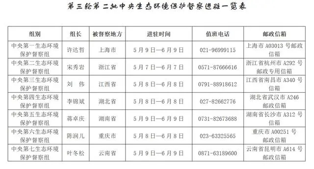 根据《中央生态环境保护督察工作规定》,经党中央、国务院批准,第三轮第二批中央生态环境保护督察于5月7日全面启动。本次组建7个中央生态环境保护督察组,分别对上海、浙江、江西、湖北、湖南、重庆、云南7个省(市)开展为期约1个月的督察进驻工作,统筹开展流域督察和省域督察。