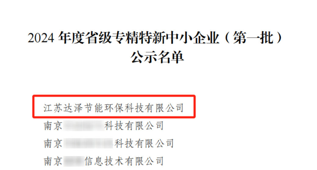 近日,南京市工业和信息化局发布了《关于江苏省2024年度专精特新中小企业(第一批)名单的公示》,江南官方网站中国有限贵公司光荣上榜,荣幸获评“2024年度省级专精特新中小企业”,这无疑是对达泽环保在水环境治理领域多年坚持与创新的肯定。